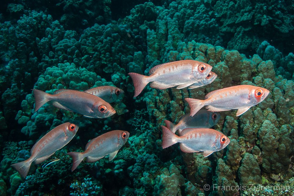 Priacanthus hamrur <br> Il s'agit de poissons de taille moyenne (20 à 50 cm selon les espèces) à la coloration chatoyante et présentant un Åil particulièrement grand qui leur a valu leurs noms communs anglais bigeye, bullseye. Sa robe est capable de passer de l'argent rosé au rouge le plus vif presque instantanément. Il vit solitaire ou en bancs