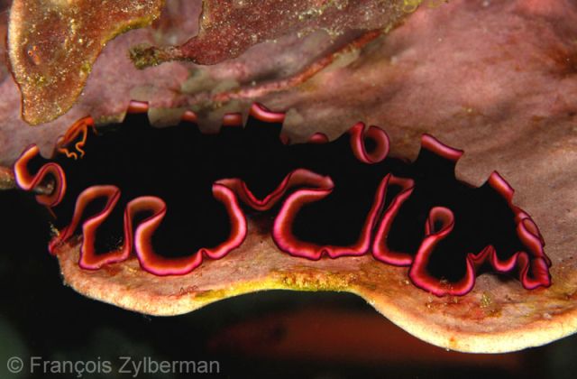 This cowrie feeds on gorgonian of the genus Euplexaura. The colouration of the mantle is unique for the whole genus.