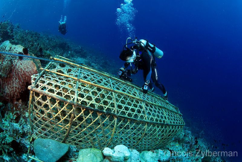 Les frogfishes ou poissons-crapaud sont certainement les créatures les plus étranges sur le récif. Ils sont très rares et plus encore difficiles à voir. Mimétiques, ils sont les maîtres du camouflage. Les Frogfishes emploient un arsenal de techniques de maquillage pour imiter les objets inanimés (éponges, coraux, algues ou roches) ou pour se mêler au fond ambiant. Ils peuvent changer de couleur en quelques jours pour imiter un nouvel environnement. La majeure partie du temps, un frogfish reste immobile attendant une proie. L’épine dorsale avant est transformée en « canne à pêche » (illicium), et est équipée d’un appât (esca), qu’il peut contracter et tortiller imitant un petit poisson, une crevette ou un ver. Quand une proie confiante est attirée, le frogfish ouvre son énorme bouche, aspire la proie et l’avale. Ceci se produit tellement rapidement qu’aucun poisson ne peut réagir. La proie n’a aucune chance de lui échapper. Un autre attribut unique et étonnant des frogfishes est leurs nageoires pectorales. Elles ont un coude et elles sont employées plus pour ramper que pour la natation. Leurs doigts, finissant parfois avec une griffe, sont conçus pour saisir et se tenir. L’imitation et le camouflage rendent les espèces difficiles à identifier exactement. Il est souvent impossible de le faire en regardant une photographie.