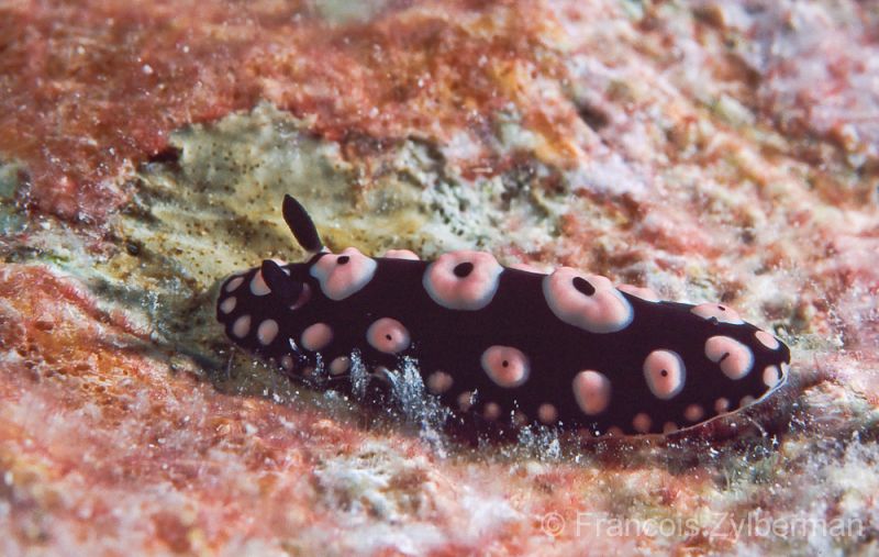 Phyllidiella annulata has a distinctive dorsal pattern consisting of numerous pink rings (with small, low tubercles) on a black background.